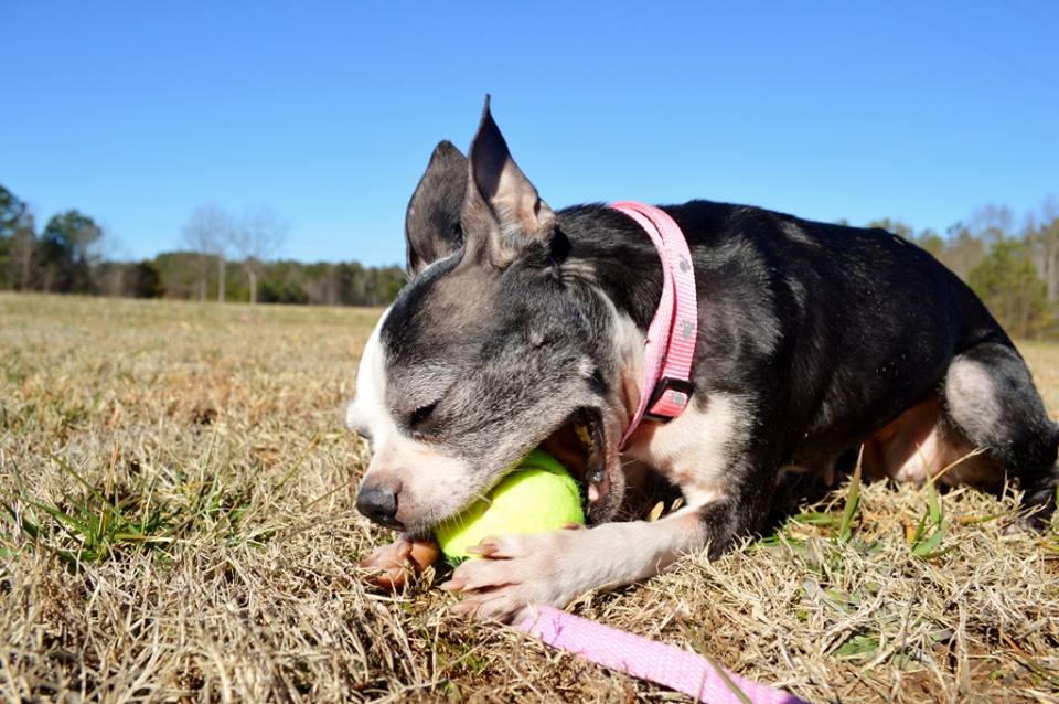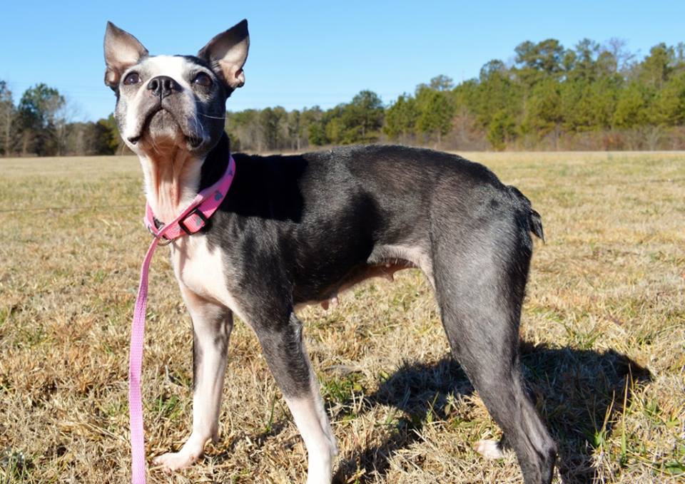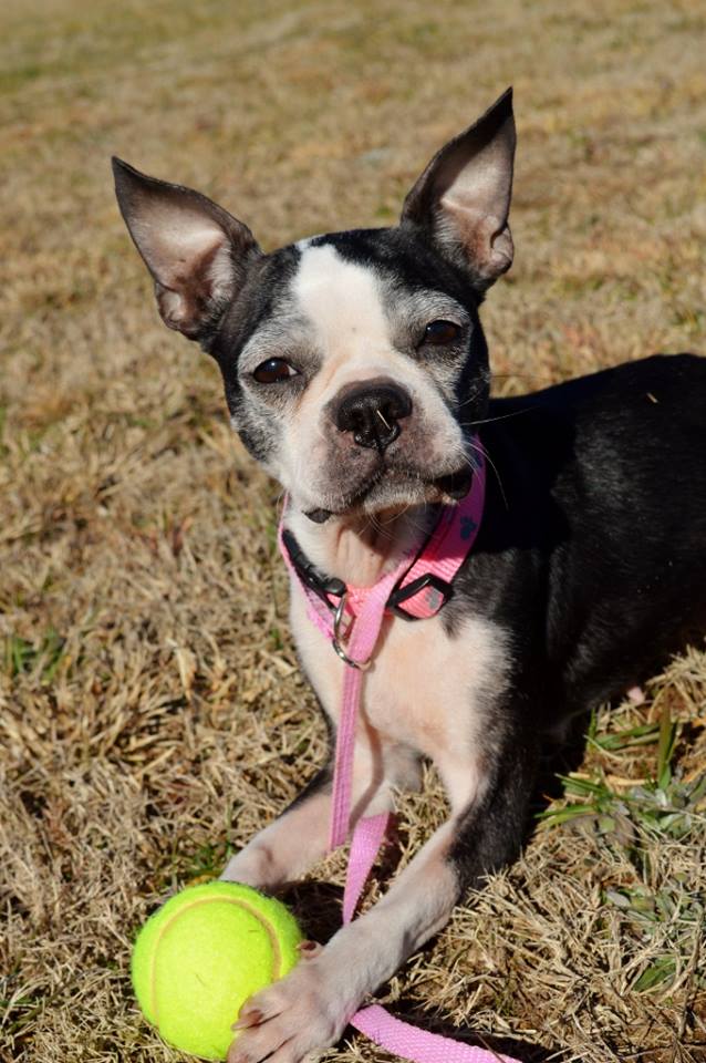She’s a bit on the thin side, but eats well so she should gain weight quickly and be perfect! Emma is done being a mom and is ready to be someone’s baby! So far, she gets along with all the other Bostons she came in with and we’ll be introducing her to new dogs soon as well. She would love a family with a fenced yard to play fetch in.