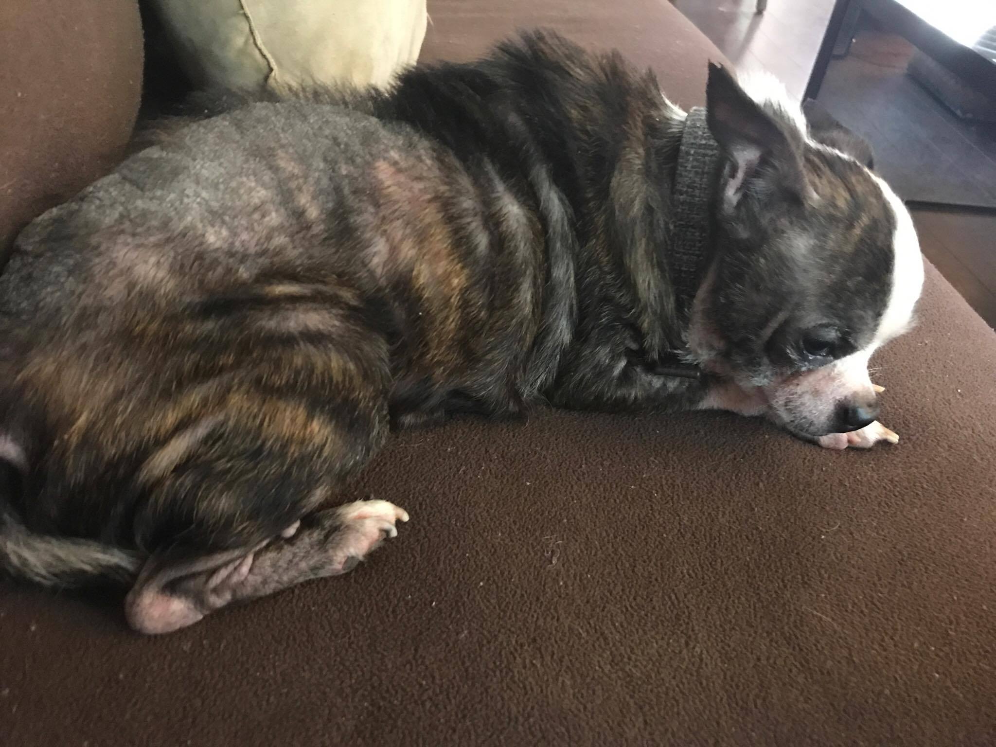 Opossum was missing most of his fur and his skin was painfully infected. His toenails were so long they were curving into the pads of his feet. He also had a painful ear infection. Luckily Opossum was heartworm negative and we were able to immediately address his other concerns.