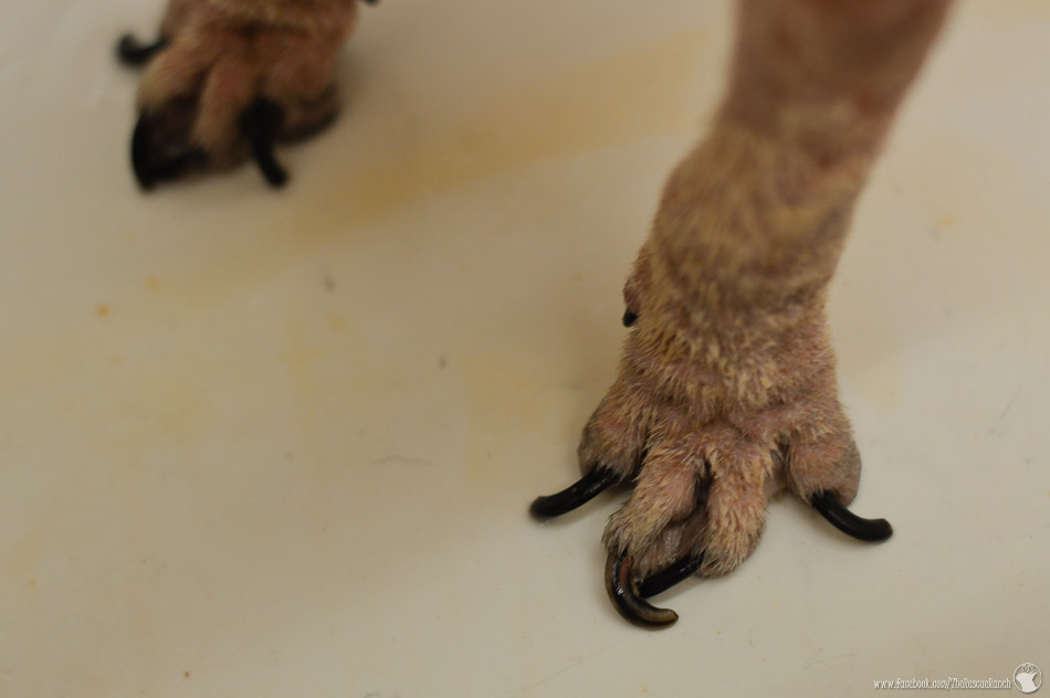 Poe has sarcoptic mange, which is bad news. Sarcoptic mange is highly contagious to people and other pets. Poe is in isolation and has began treatment with moxidectin (Advantage Multi) to kill off the scabies mites that cause sarcoptic mange and an antibiotic to treat the secondary skin infections caused by the scratching. This will also help address his ear infections.  His nails are so long were folding over and getting caught up with each other. We dealt with a bath and a nail trim first thing on arriving to the Ranch.